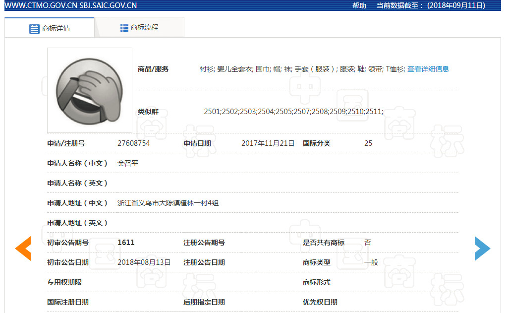 从初审公告上我们可以看到,“捂脸”表情注册的只是服装鞋帽等25类商品,我们知道,商标分类注册是按核定图样核定使用商品保护。
